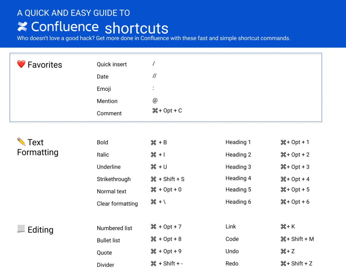 Confluence is a robust device for staff collaboration. Shortcuts streamline your work. In line with Atlassian, almost 80% of customers report elevated effectivity when utilizing keyboard shortcuts. As an alternative of clicking by means of menus, you should use straightforward key combos to carry out duties.